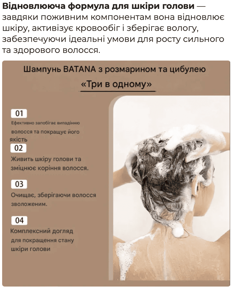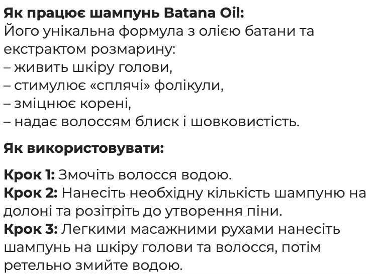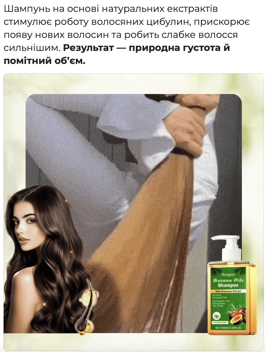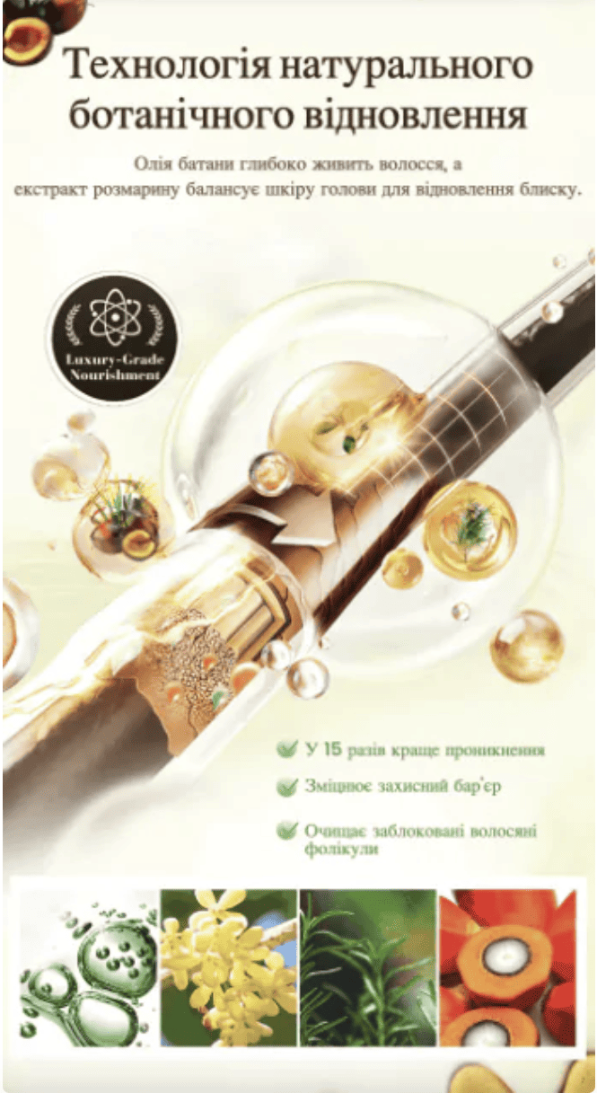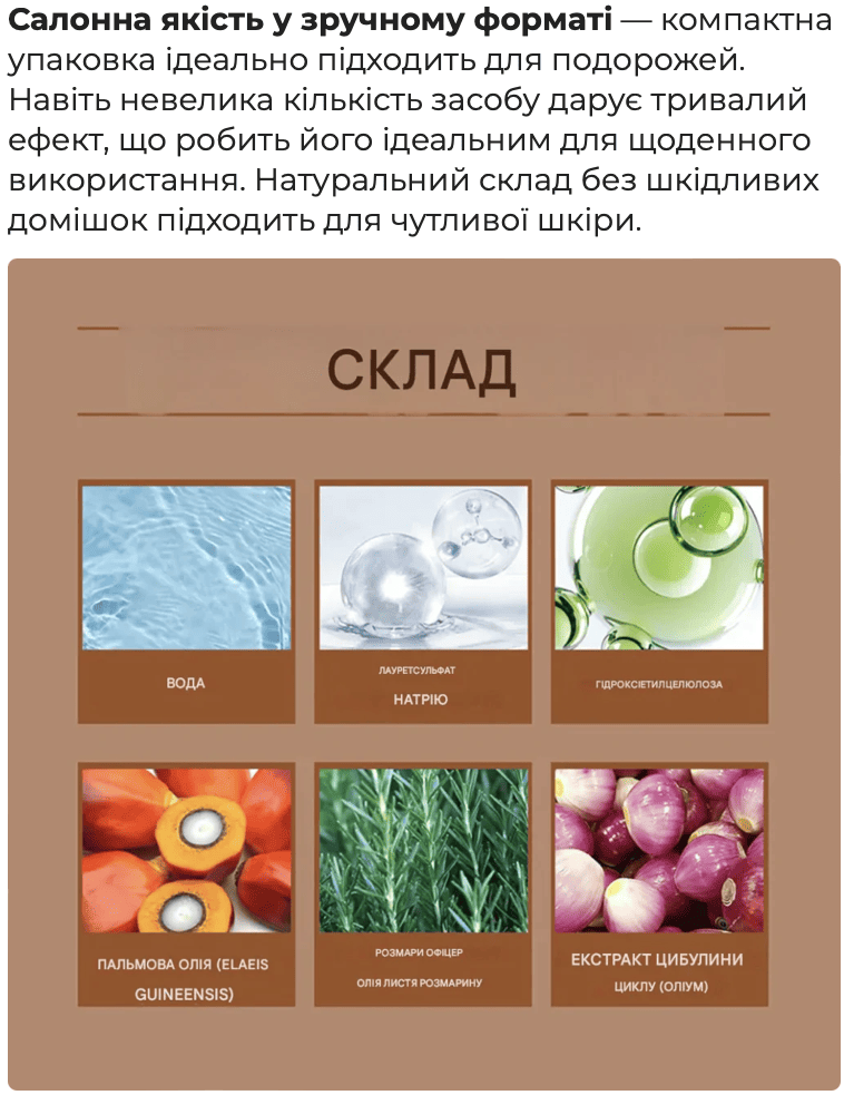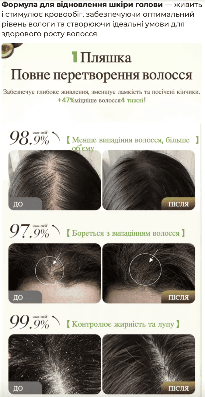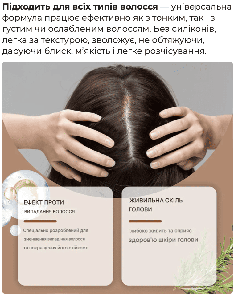 Cприяє росту волосся, додає густоти і обʼєму