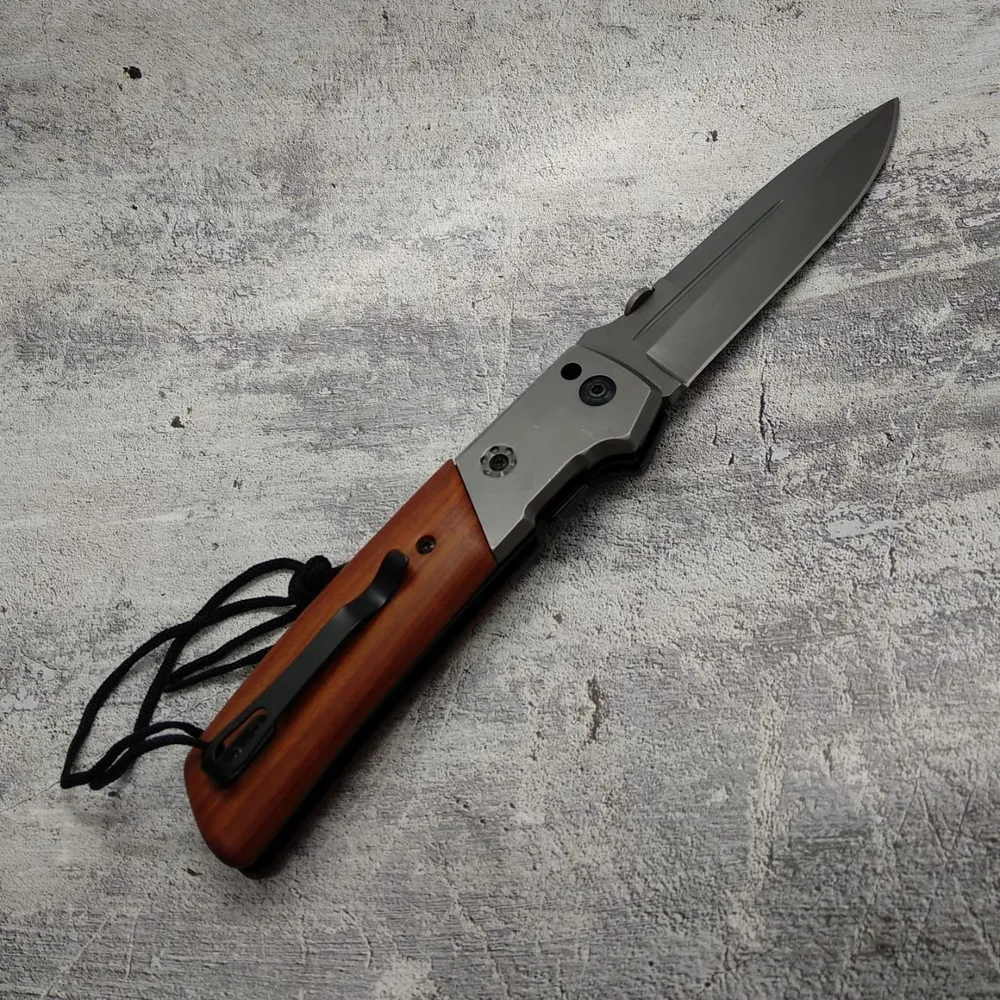Заточка клинка має велике Лихо, яким зручно ривати землю, підриває каміння. Проста непрозора і неперервна Надечна конструкція. Покриття клинка і накладок – нітрид титана. Накладки були зроблені з дерева і сталі. Зручний “язичок” на замку підвищує комфорт при складанні ножа. Гарний ніж для авто.
