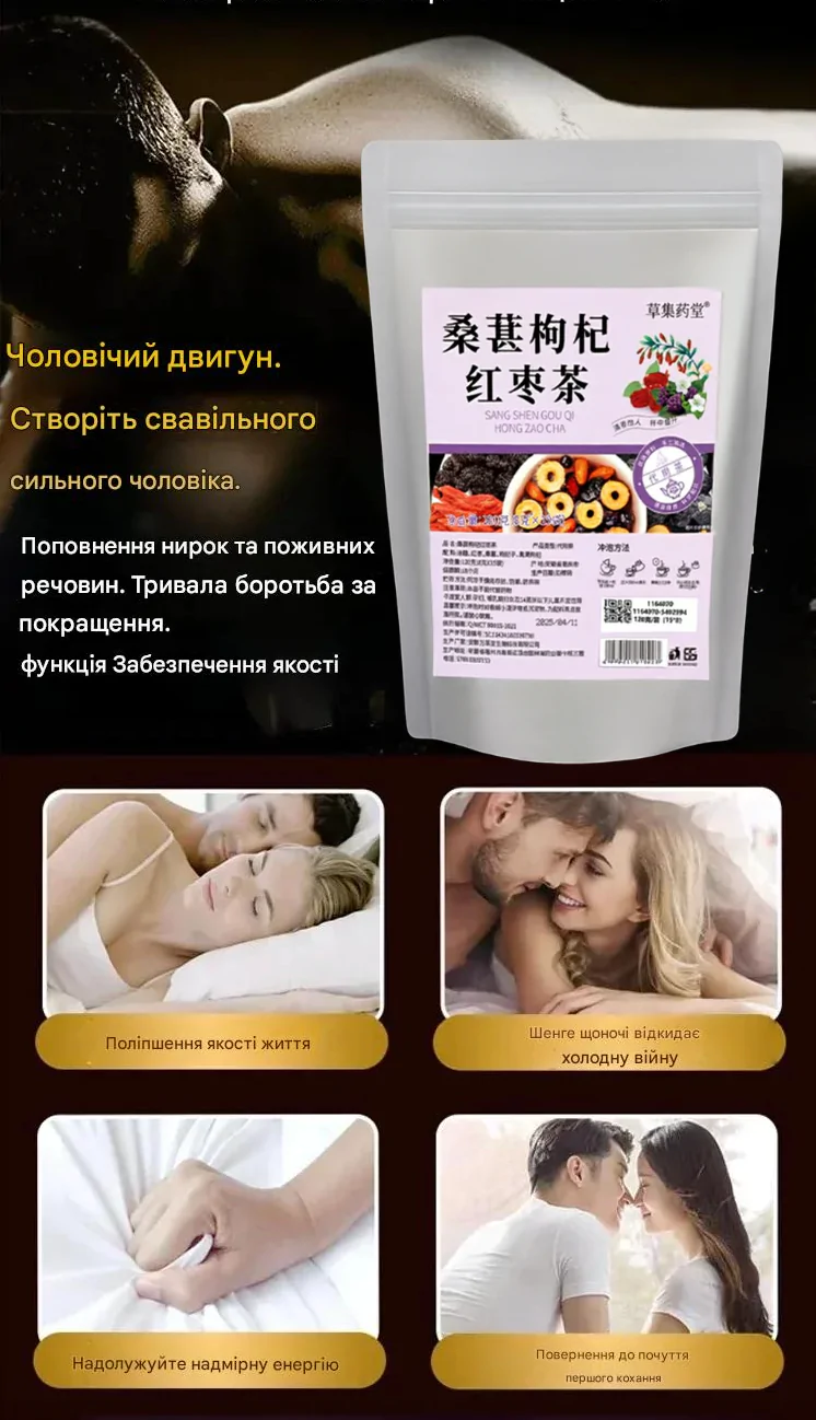 Після першого ковтка чаю ти відчуєш, як всередині відновлюється енергія, немов хвиля сили, що прокидається. Шовковиця, колкоза та червоні фініки заповнюють твоє тіло життєвою силою, даруючи впевненість і рішучість. Це не просто чай — це еліксир для чоловічої сили, що відновлює баланс і заряджає енергією. Ти відчуєш прилив сили, готовий впоратися з будь-якими викликами, і твоя партнерша буде в шоці від твоєї нової енергії та рішучості.