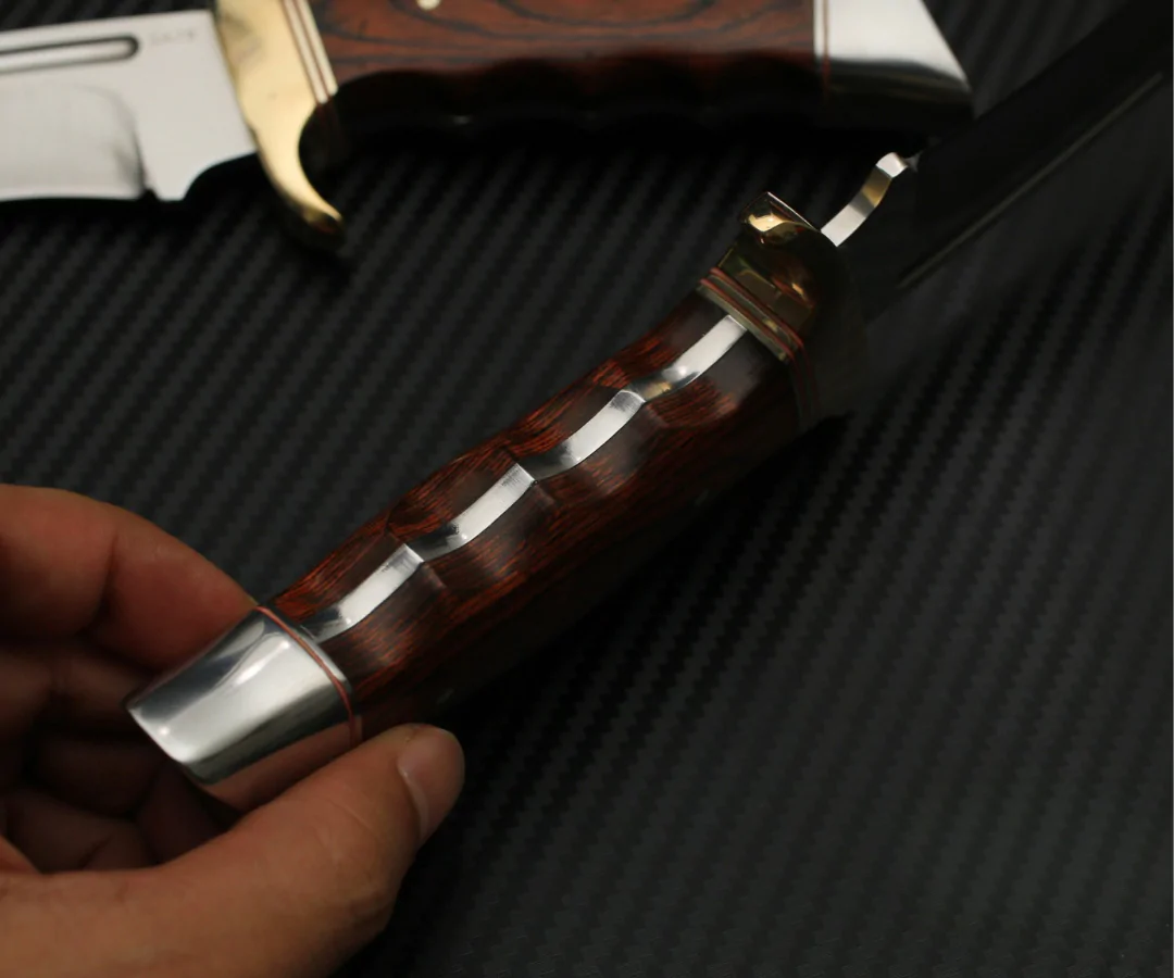 Рукоять виконана з натурального дерева, доповнена металевими елементами, які підсилюють конструкцію і створюють ефектний вигляд. Завдяки ергономічній формі ніж зручно лежить у руці навіть при тривалому використанні.