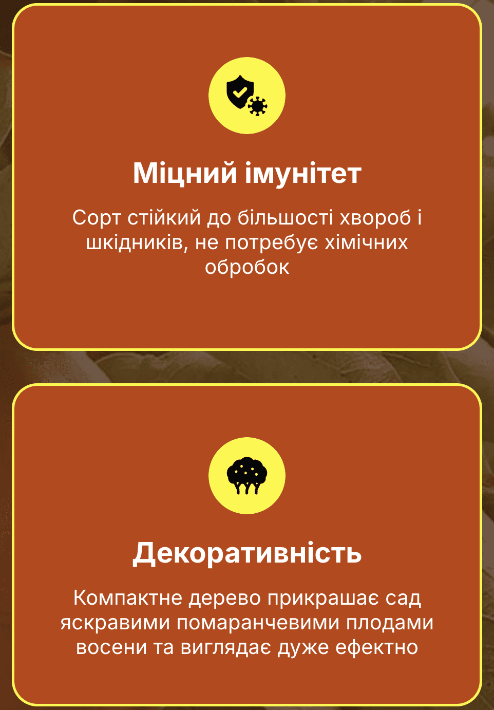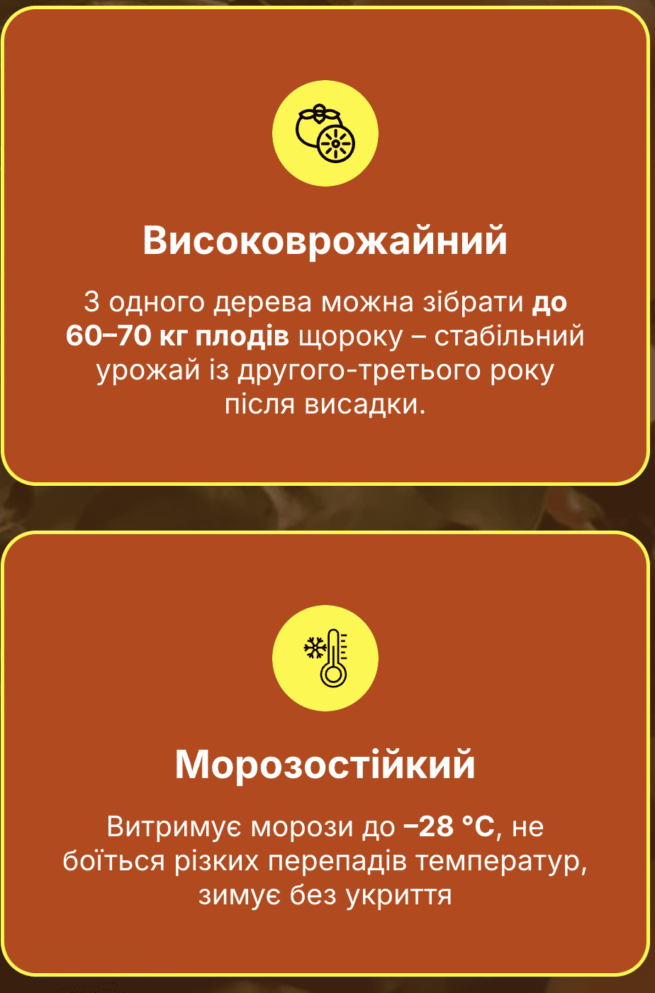 Стійкий до основних хвороб та шкідників, швидко адаптується до різних ґрунтів. Ідеально підходить для приватних садів і дачних ділянок – плодоносить уже на 2–3 рік після посадки.