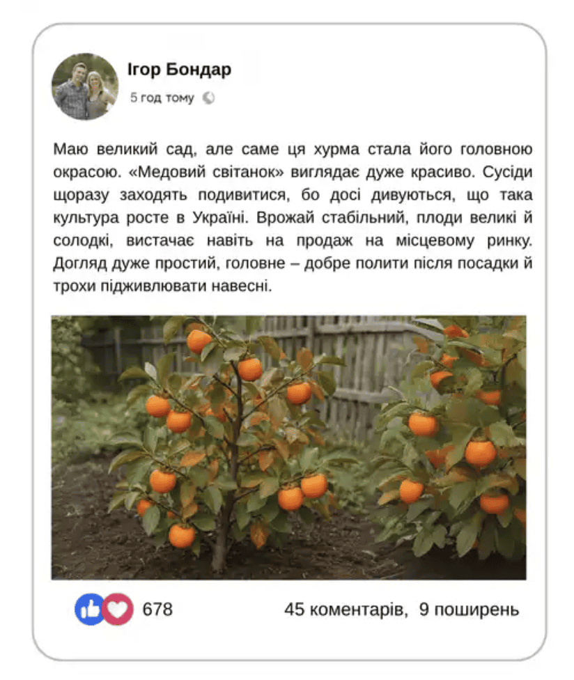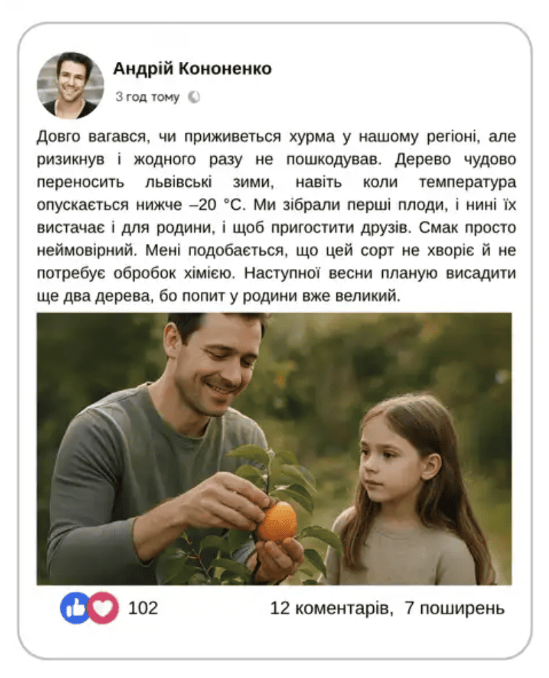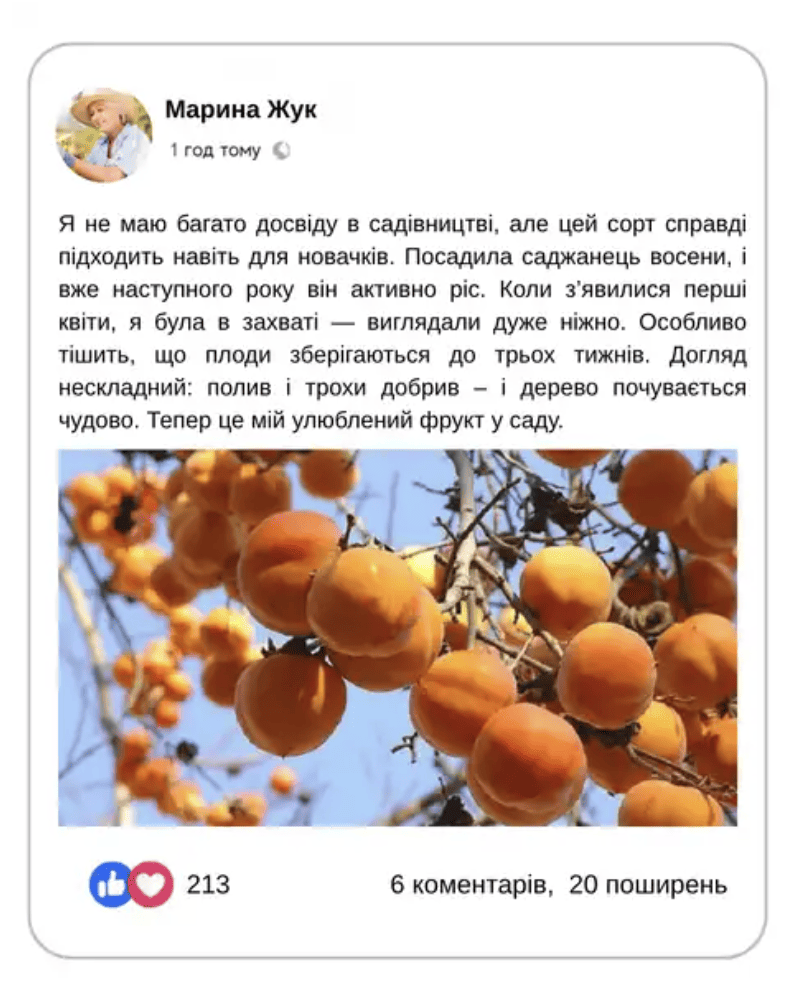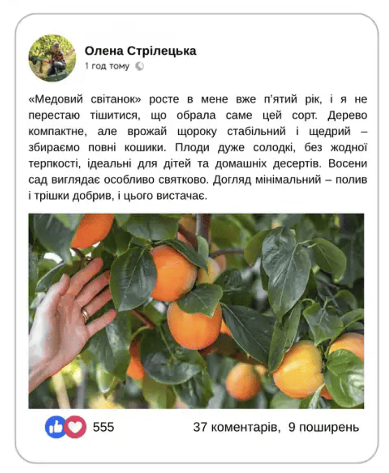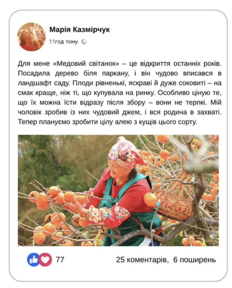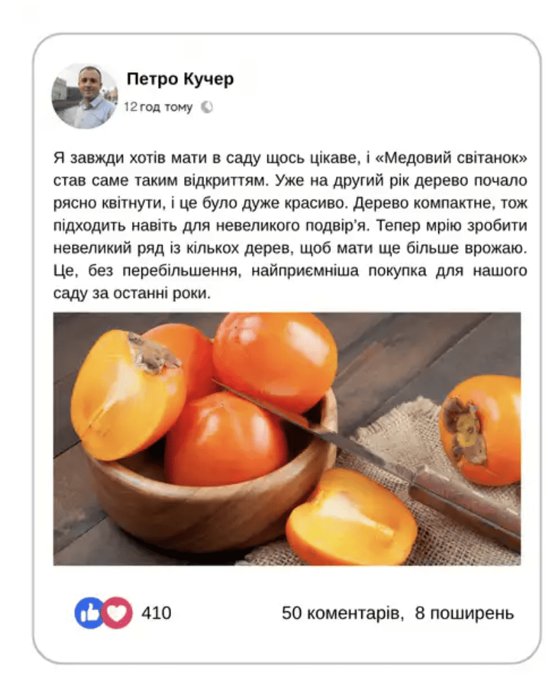 ДІЗНАЙТЕСЬ ВІДГУКИ ТИХ, ХТО ВЖЕ ВИРОЩУЮТЬ НАЙСОЛОДШУ ХУРМУ "МЕДОВИЙ СВІТАНОК":