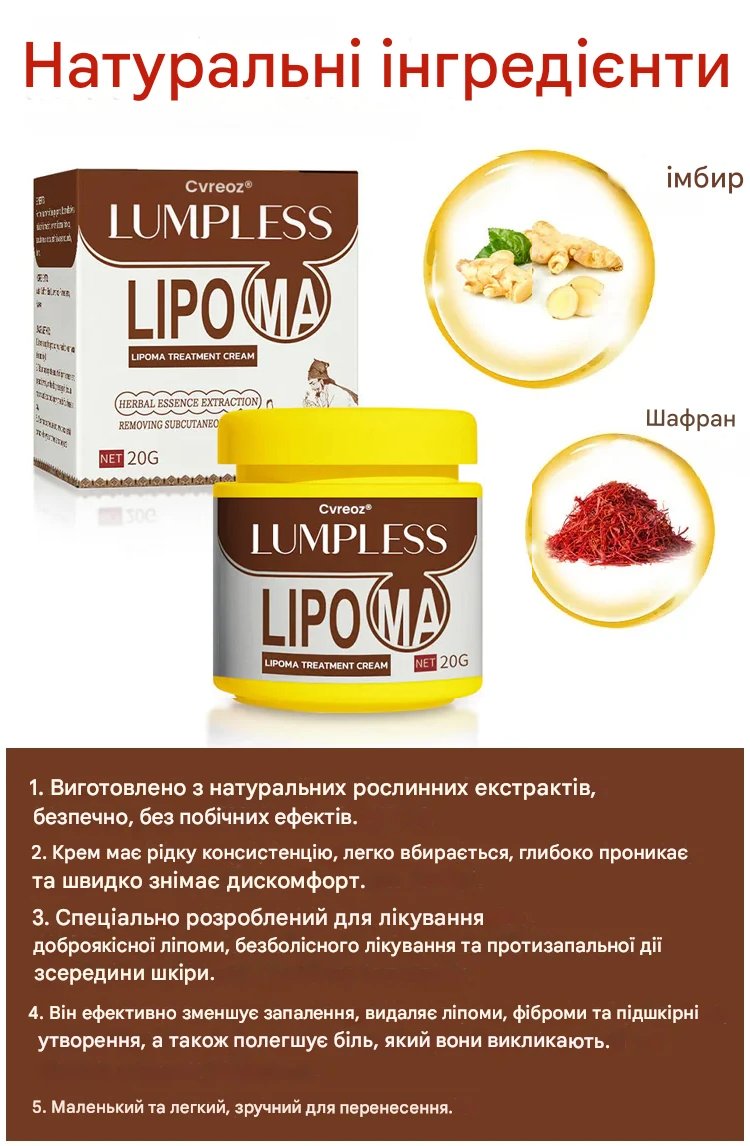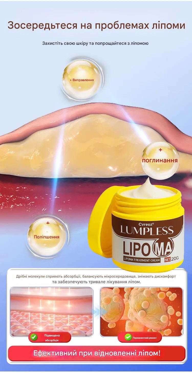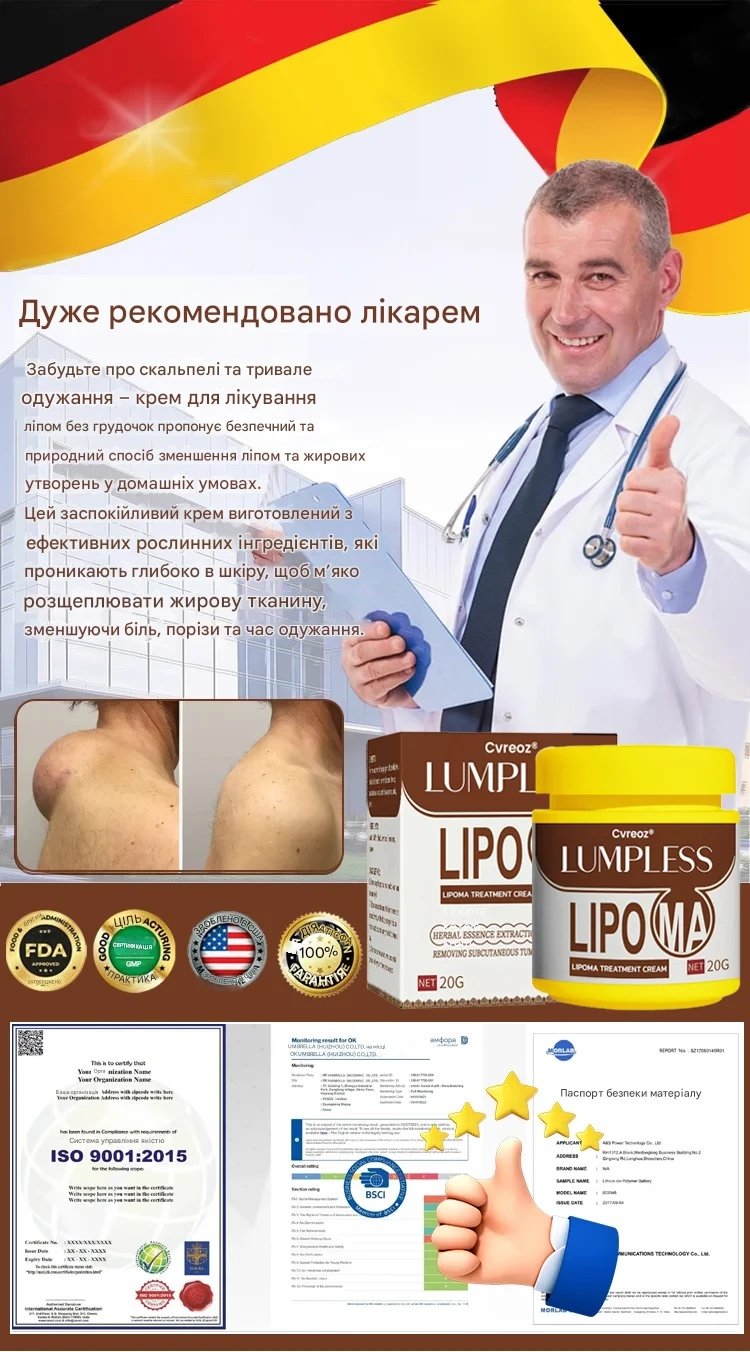 У мене на спині було чимало утворень, які лікар діагностував як ліпоми. Вони були досить нешкідливими, і мені порадили видалити їх хірургічним шляхом, але я не міг собі цього дозволити». Коли я шукала в інтернеті домашній засіб, я натрапив на цей крем Вночі я наніс крем і, прокинувшись, виявив, що ущільнення зменшилися. На той час деякі з них сплющилися. Набряк великої ущільнення біля плеча також значно зменшився. Цей засіб справді подіяв. Я надзвичайно задоволений результатами