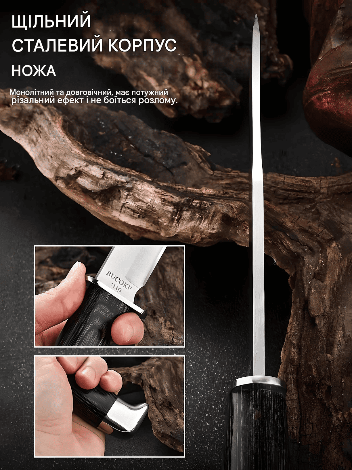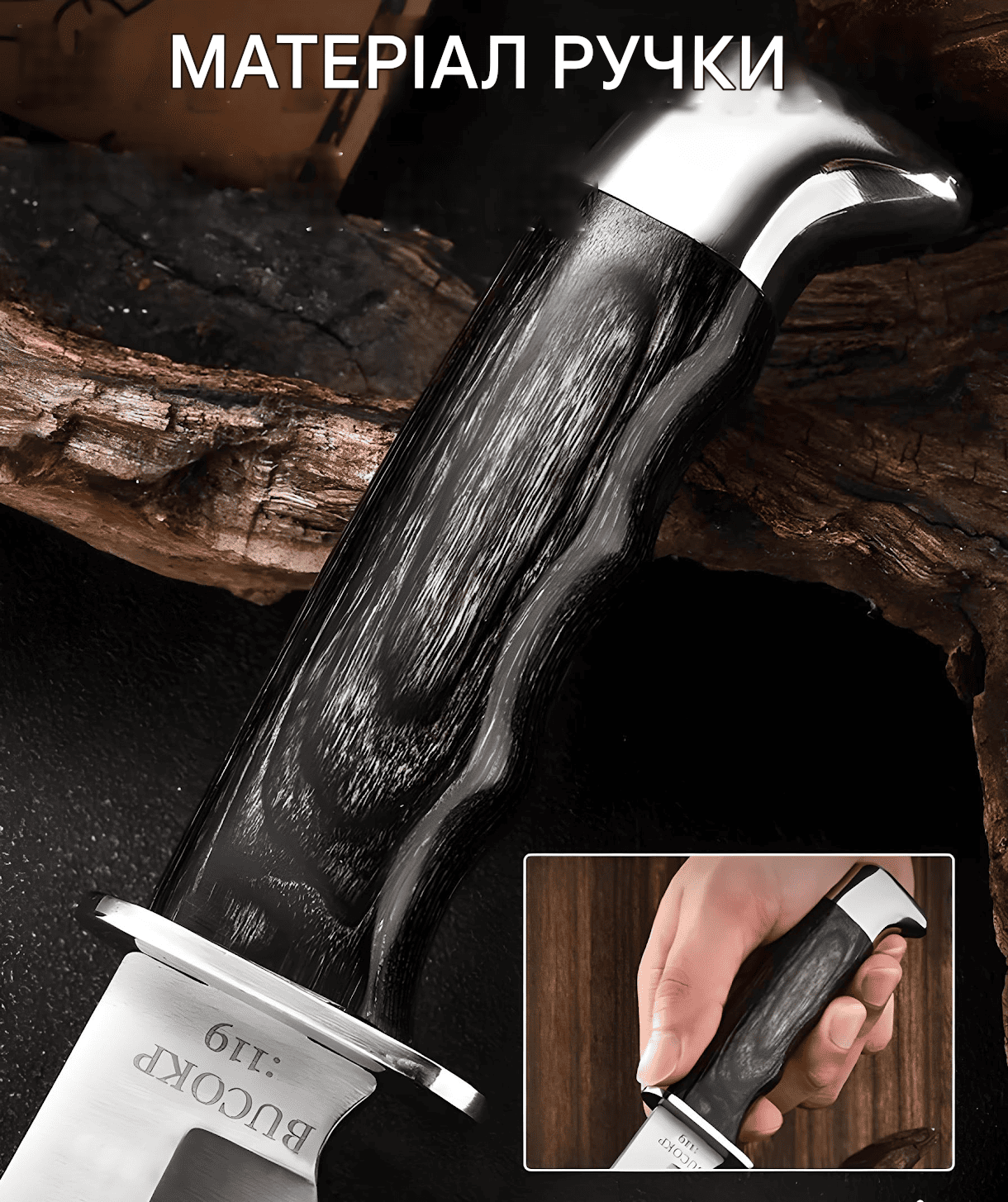 Рукоятка BUCK 119 з високоякісного полімера має анатомічну форму для зручного утримання. Металева гарда забезпечує додатковий захист і комфорт.