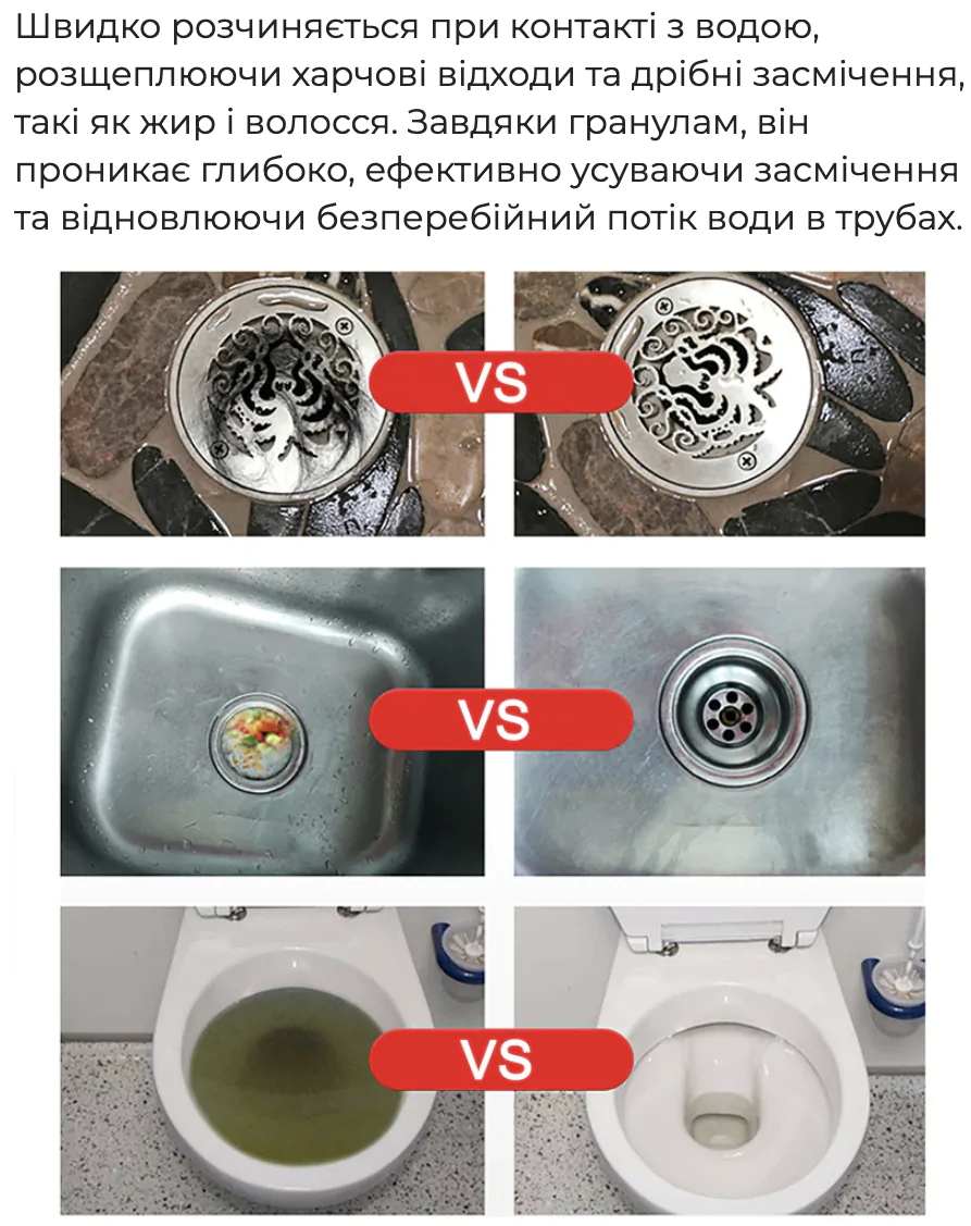 - Призначення:швидко розчиняє жири, волосся, папір, мильний наліт та інші органічні відходи