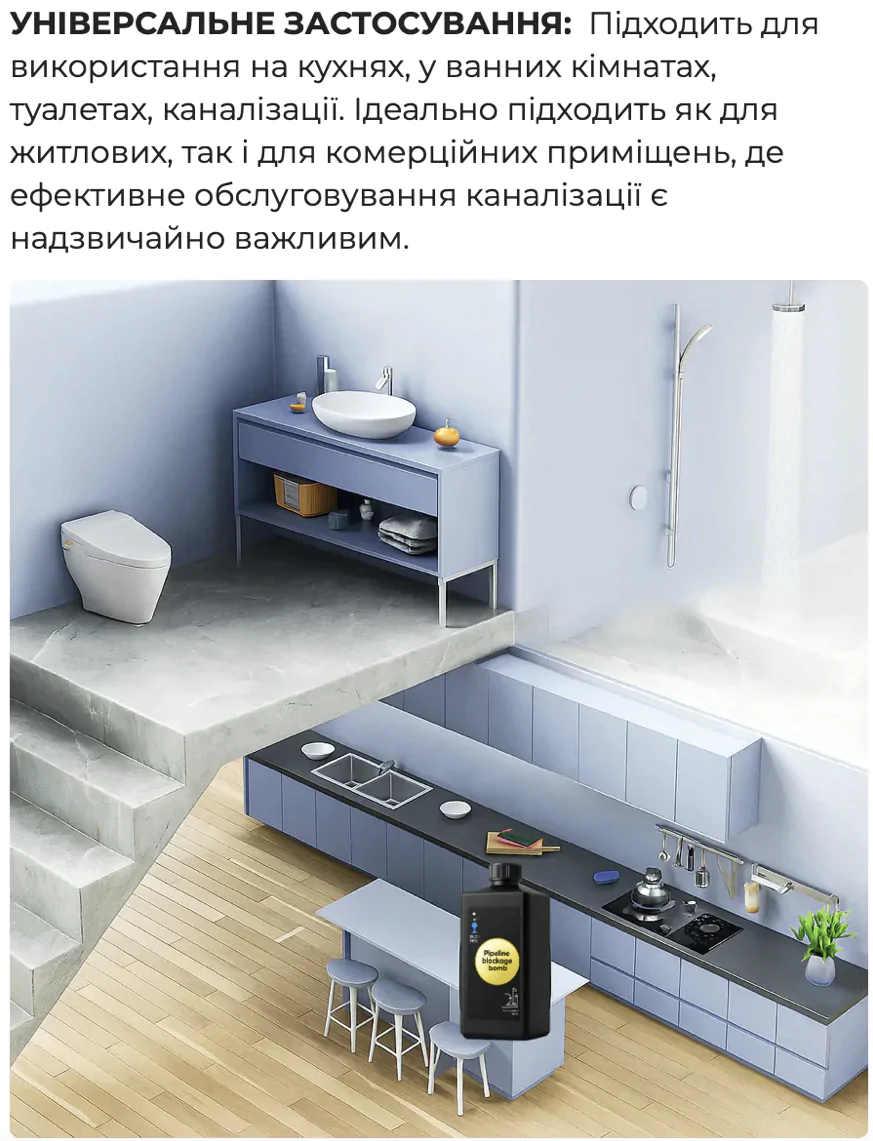 - Безпечність:не пошкоджує труби та септичні системи